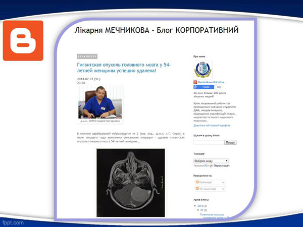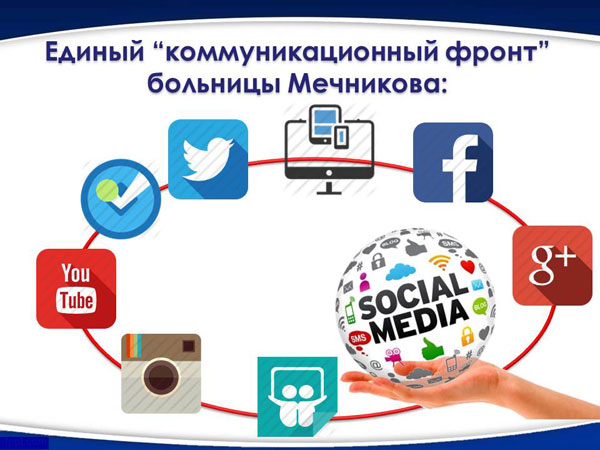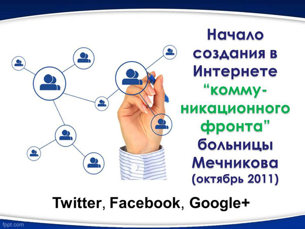 Понимая эту стратегическую задачу, мы, под руководством главного врача РЫЖЕНКО Сергея Анатольевича, с октября 2011 года начали создание в Интернете "коммуникационного фронта" больницы Мечникова. В короткий срок были открыты представительства больницы во всемирных онлайновых социальных сетях - Twitter, Facebook, Google+.